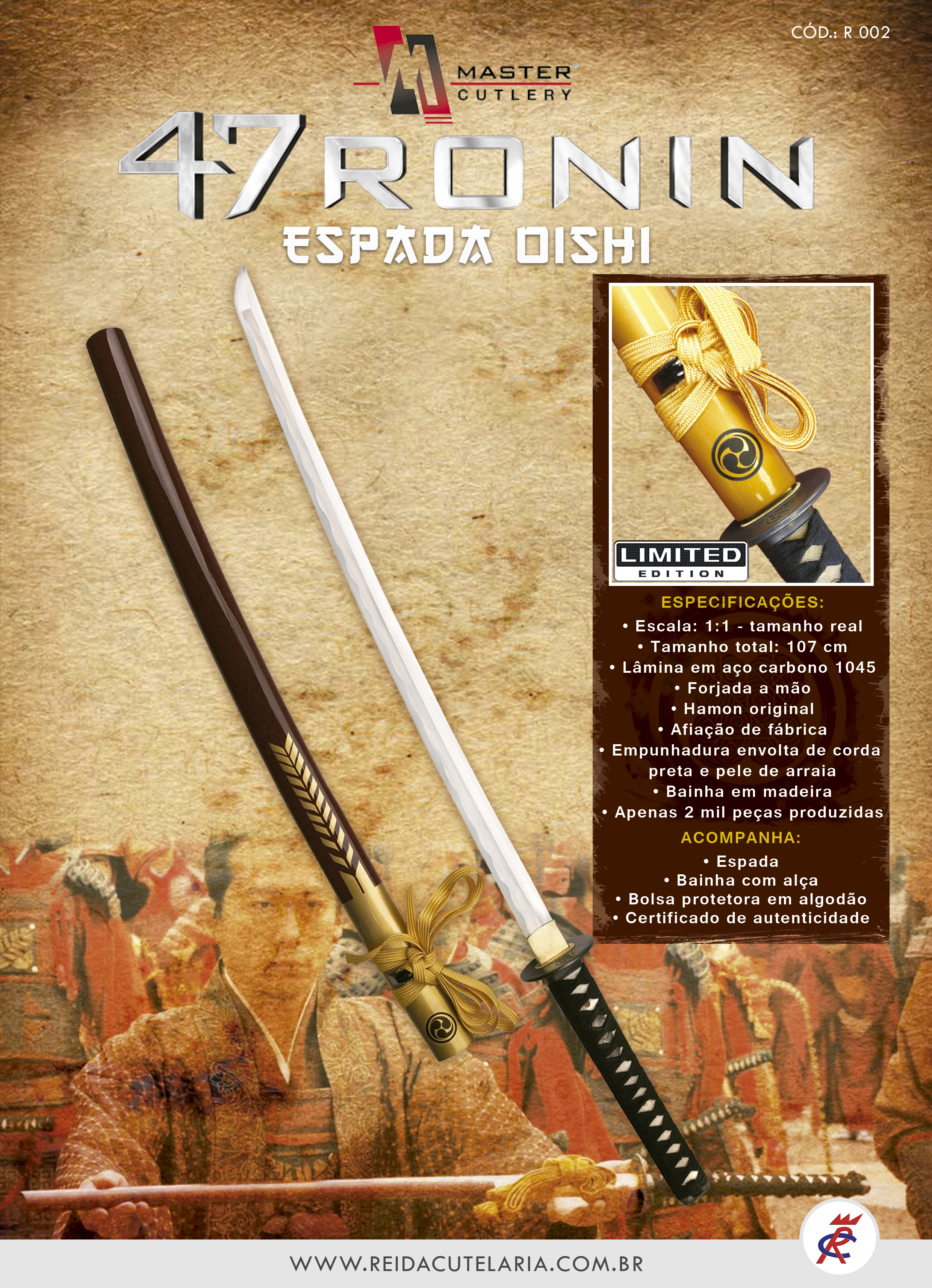 - Composição da Embalagem: 1 Espada Oishi Ronin 47, 1 bainha - Master Cutlery